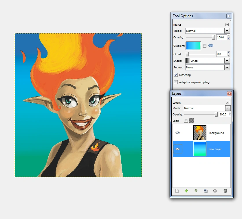 If you haven't done it already, prepare a new layer: Go to the menu -> windows -> dockable dialogs or use CTRL+L, in case you not already have layers open. Click on the paper icon on the left in that window. Another window will open, choose "transparency" as layer fill type. Click OK and the new layer should appear over your previous layer. Just move it down with the arrows or LMB. Then use the blend tool inside this layer and drag it from the top down. Your result should be looking like the image to the right.