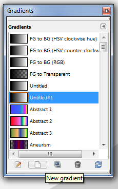 There is also a more complex way to create a gradient. Go to the tool options, click on the box, which lets you choose a gradient and click on the gradient icon in the right corner. This opens another box: Choose the second icon there, which says "new gradient". A new window will open with a large black and white gradient and "levers" below of it. Now choose from your palettes or from the back- and foreground colors and drag the colors into the levers/arrows and move them around to adjust the colors a little more. Don't forget to name and save the new gradient!