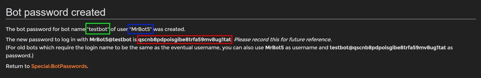 Figure 1: Bot name (green), account name (blue), and bot password (red)